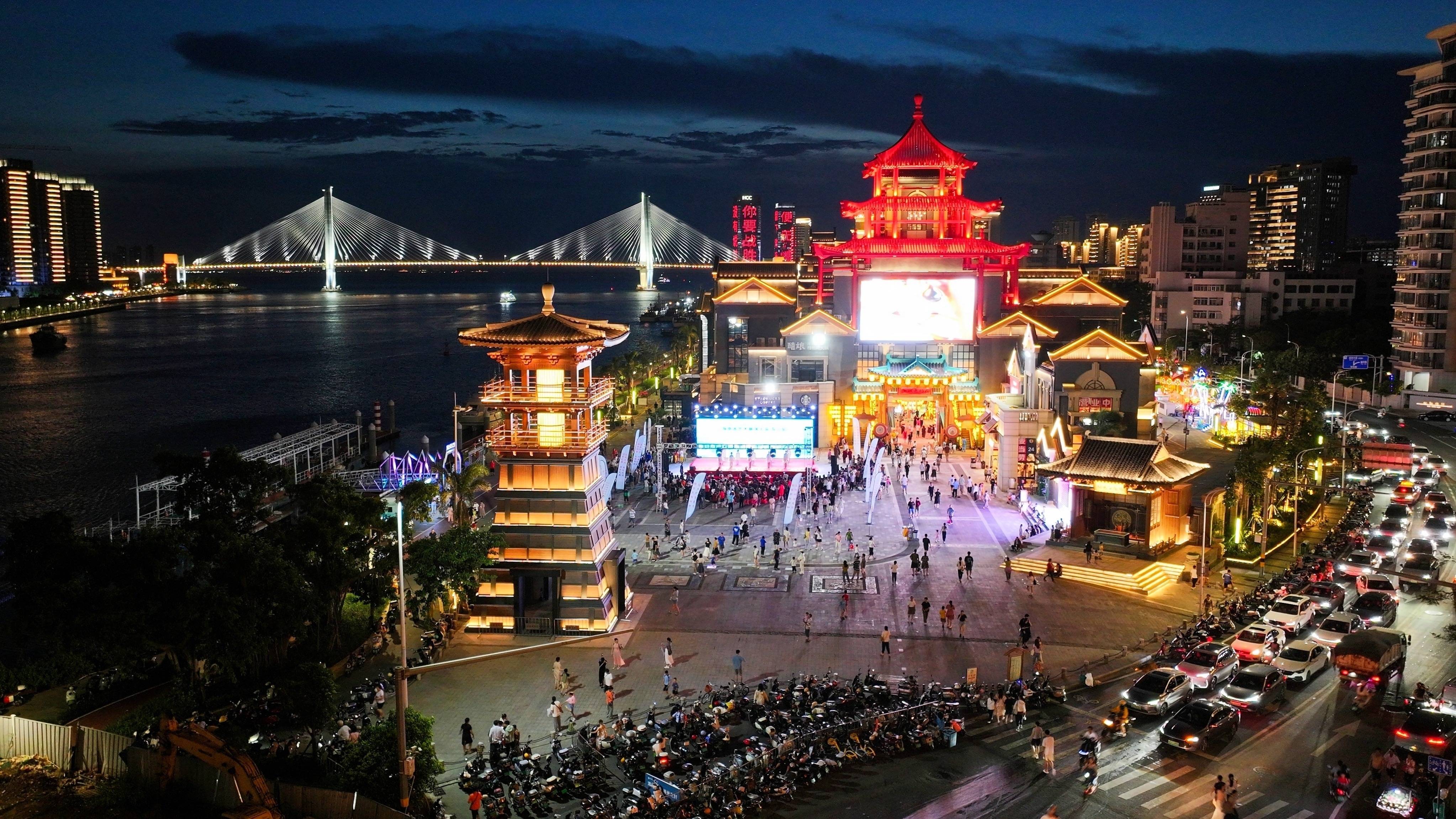 8月7日傍晚7时许,海甸溪入海口处,岸边的东坡老码头亮起灯光,灯火阑珊间更添几分古韵。