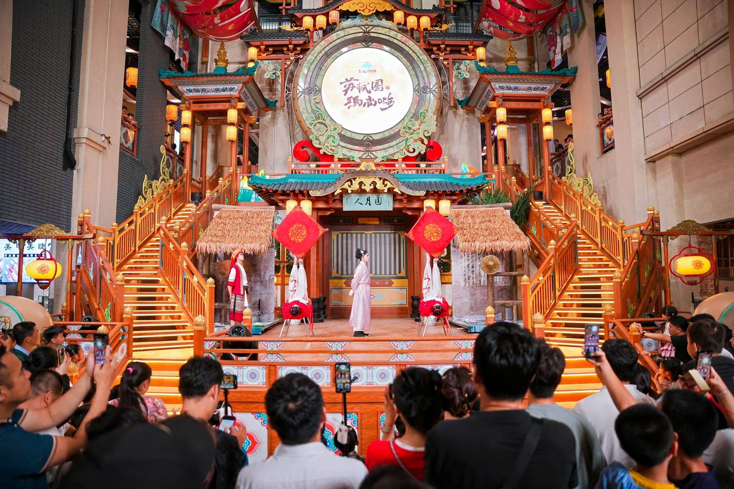 室外的海风,拂面送爽;室内的“宋风”,热潮涌动。东坡老码头里人头攒动,不少铺面前市民游客排着队选购好物,舞台前更是围得里三层外三层,大家踮脚翘首,等着看一场宋代风情演出。
