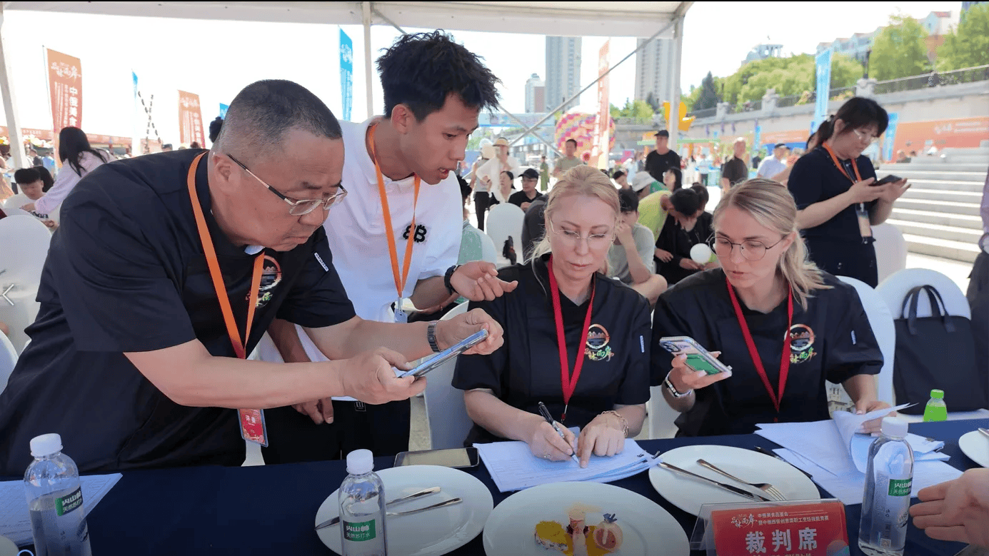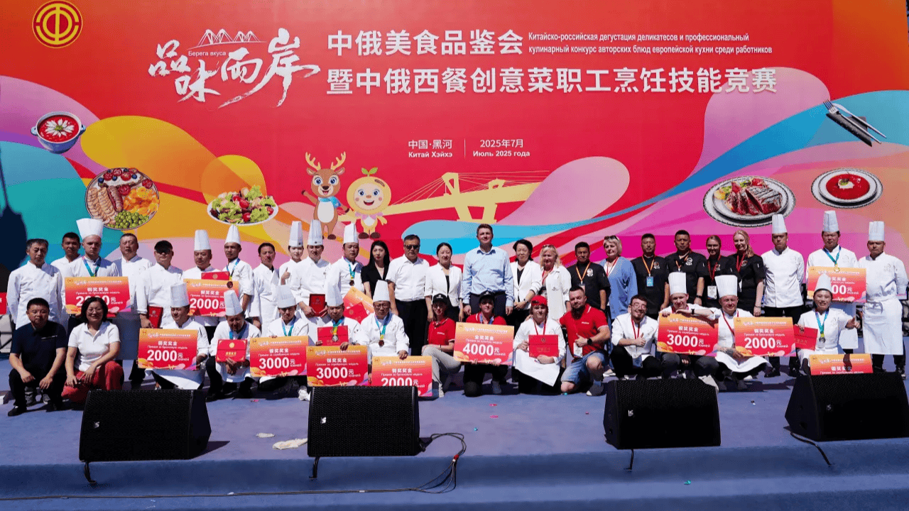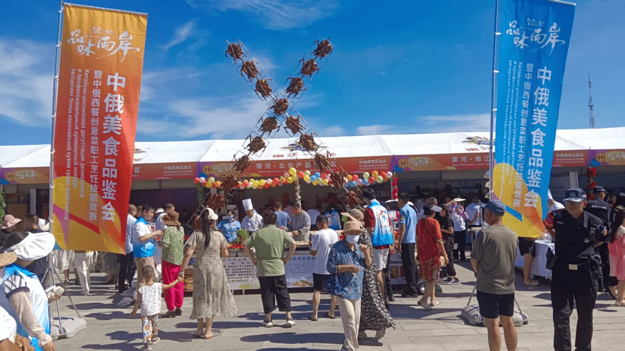 25日,中俄美食品鉴会暨中俄西餐创意菜职工烹饪技能竞赛在黑河市启幕。黑龙江公园西兴路广场热闹非凡,人流如织。中俄西餐创意菜职工烹饪技能竞赛的8个操作区整齐排列,黑龙江省12支代表队与俄罗斯布拉戈维申斯克市4支代表队数十名选手汇聚在此进行技能比拼。他们身着洁白的厨师服,手持厨具,无比专注地投入竞赛。切配、煎烤、摆盘……在精湛刀工、娴熟手法、优良食材的加持下,选手们火力全开,一道道融合了两国风味的创意美食在他们的手中诞生,展现出独特的匠心和文化传承。现场香气四溢,围观群众不断发出赞叹。