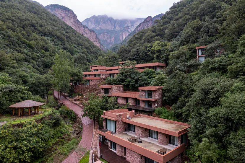 推开房门,清新的空气扑面而来。民宿外,小桥流水,一条红色小路蜿蜒向前……杏峪村为嶂石岩地貌,山体和道路呈现红色调。涧石居宿集经理张亚丽说,为让民宿与周围环境协调,特意将民宿外观打造成红色。蓝天白云、绿树掩映下,群山环抱之中的红色涧石居宿集格外亮眼。“真美!”看着这样的景色,张丽霞豁然开朗。