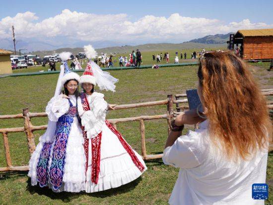 8月3日,在新疆伊犁哈萨克自治州新源县那拉提景区,两名游客身着民族服饰合影留念。
