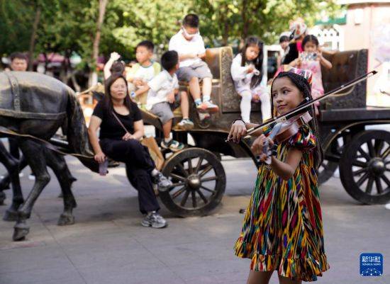 8月4日,在新疆伊犁哈萨克自治州伊宁市六星街,一名维吾尔族小女孩为游客演奏。