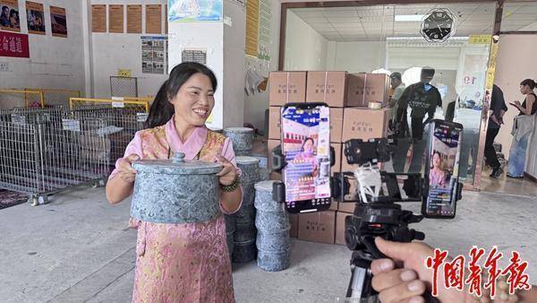 竹林妹每天中午12点开播到晚上10点,最多一天能卖出700口石锅,广东沿海地区的客户尤其青睐。韵达网点不仅为其提供了一定量的仓储空间,还为其提供了直播间。竹林妹每周会在这个网点直播两次,让客户亲眼看到石锅打包全过程。