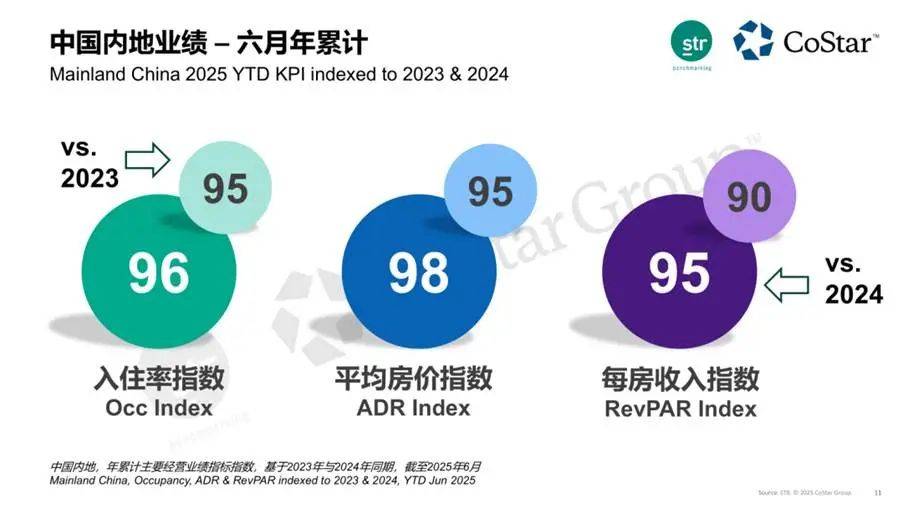暑期住宿业波动并非毫无预兆,2025年上半年已初现端倪。据STR统计,中国市场仍处于缓慢恢复阶段,2025年上半年整体RevPAR同比下降5%,入住率和平均房价双双下滑。