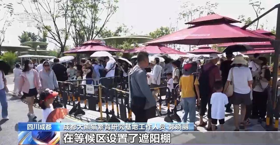 成都大熊猫繁育研究基地工作人员 郭晓丽:景区在暑假的时候,不断优化服务,在等候区设置了遮阳棚,还有户外的风扇、雾森系统,达到物理降温的效果。景区里面也有很多室内的参观点,博物馆、光影秀都是非常推荐大家来玩的。