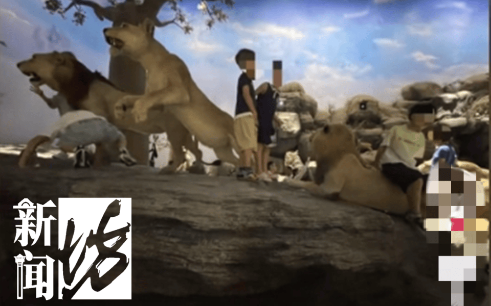 游客拍摄的一段视频显示,有近10个孩子擅自翻越围栏进入标本展示区嬉戏玩耍。有家长鼓励孩子将较小的狮子标本抱在手上拍照,甚至还有一个小男孩直接骑上了一头成年狮子标本。