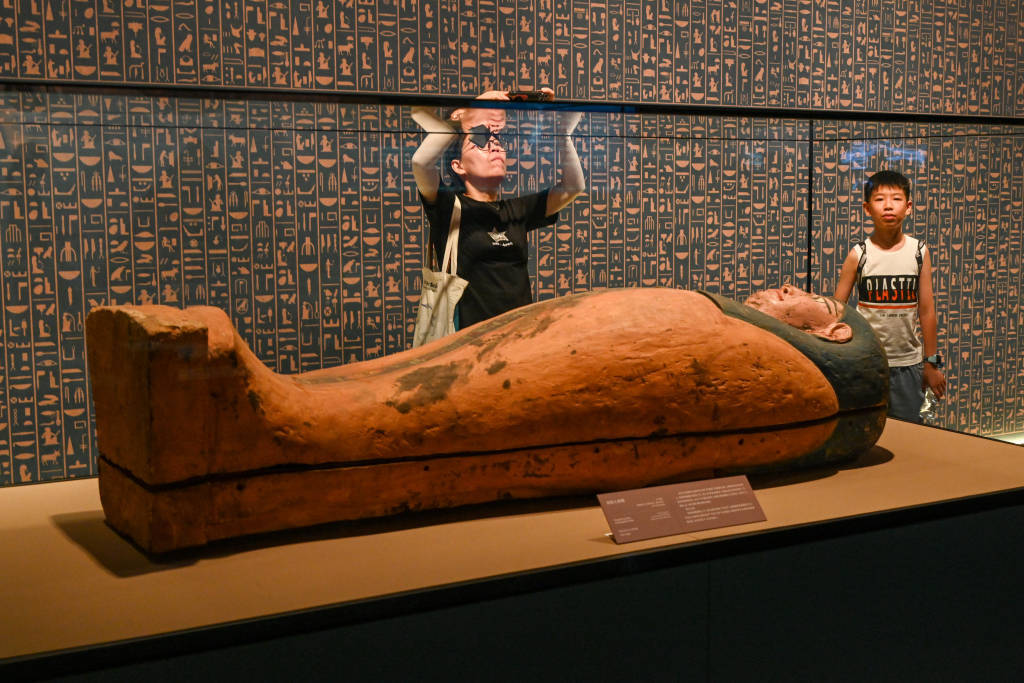 8月11日晚,“法老的国度”展厅,佩德阿蒙的彩绘人形棺。澎湃新闻 朱伟辉 图