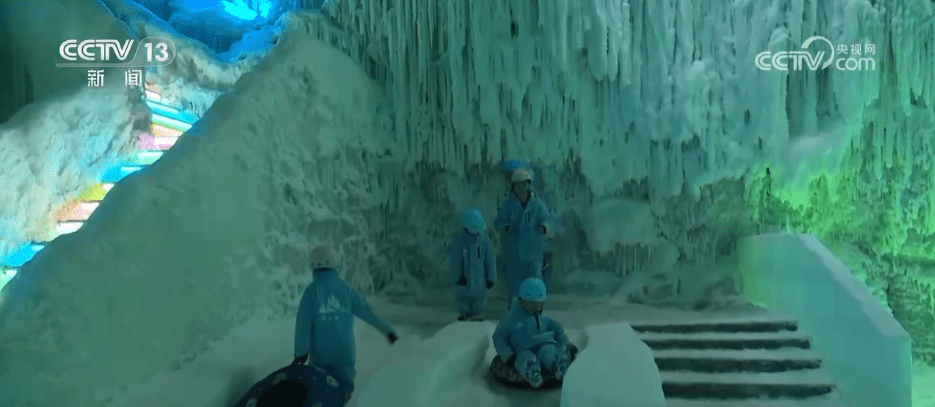 在淮南市焦岗湖畔的“冰帘洞天”景区,游客们仿佛“穿越”到了冬天。1.5公里长的游玩线路涵盖了冰上漂流、冰上保龄球等项目,大人、孩子们穿上厚厚的衣服,感受速度与激情。